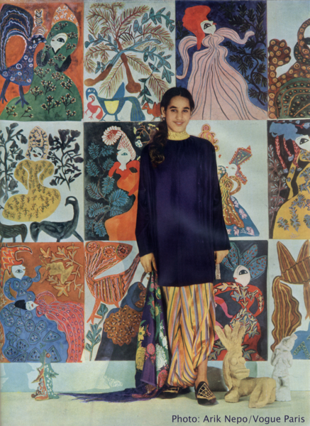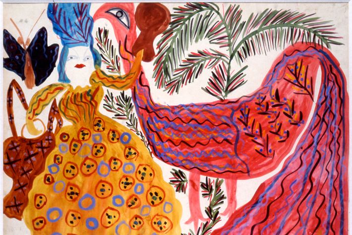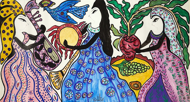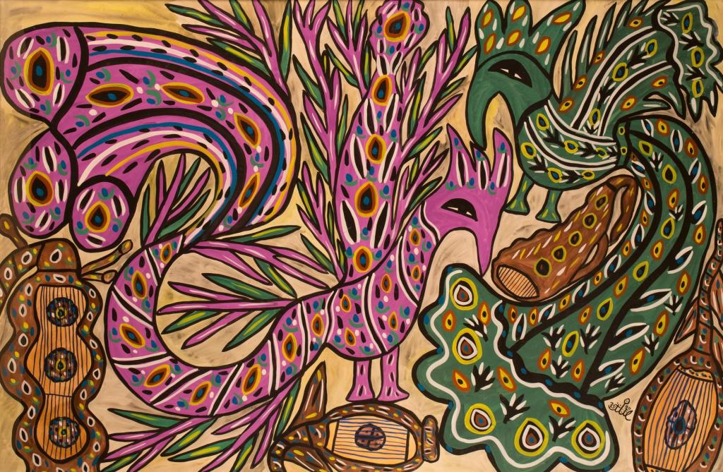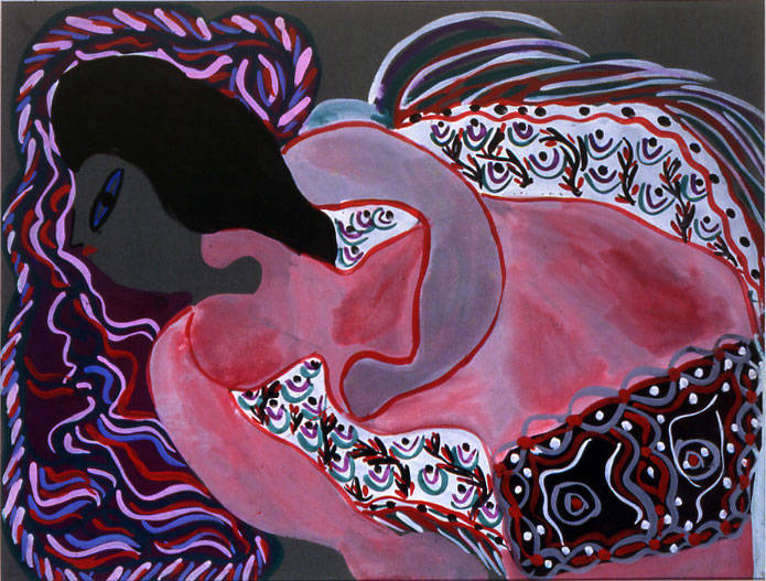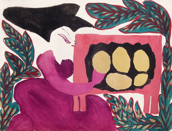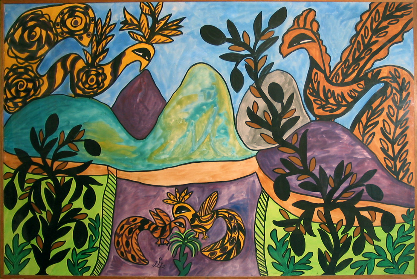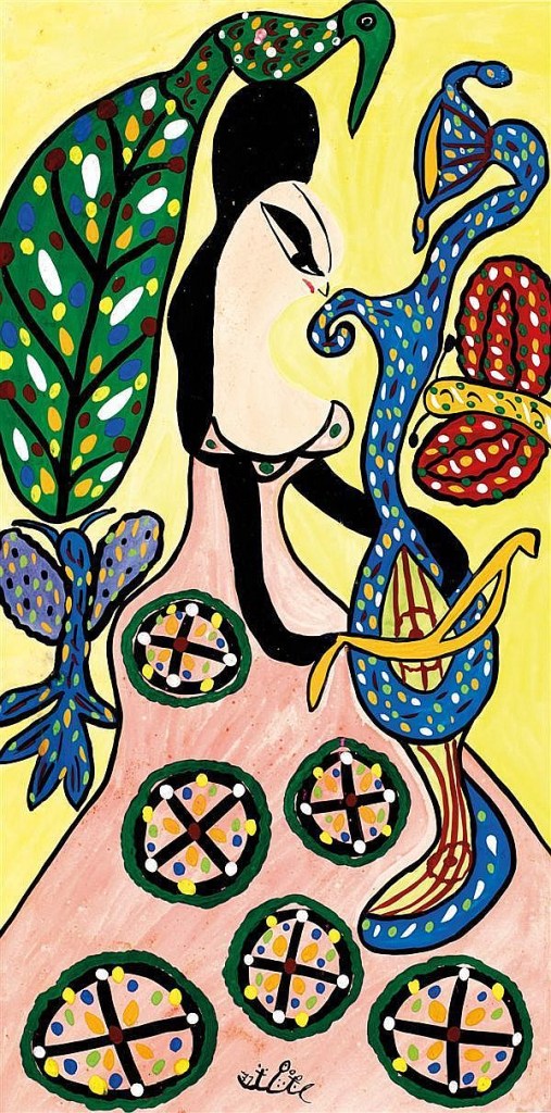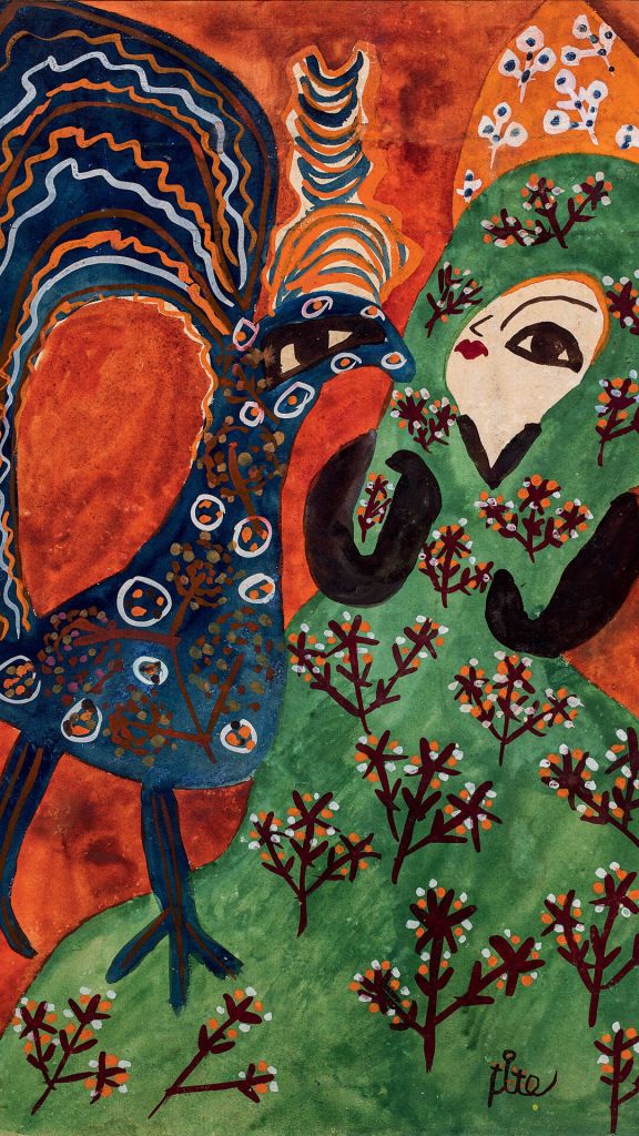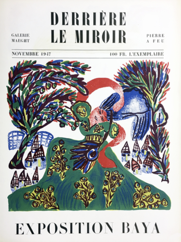 La historia continúa y el matrimonio Benhoura, después de adoptar oficialmente a Baya, abre su potencial y su trabajo a los círculos artísticos franceses y magrebíes. En 1945, el marchante francés André Maeght, de viaje en Argel, descubre entusiasmado el trabajo de Baya y lo da rápidamente a conocer en el círculo de los surrealistas. En 1947 incluyen su obra en la Exposition Internationale du Surréalisme y se dedica a la artista una exposición en la Galería Maeght de París, junto a un número monográfico de su revista asociada -la que adorna hoy mi librería-. Baya tenía 16 años y apenas podía leer ni escribir; nunca había ido a la escuela. La exposición tuvo enorme éxito y atrajo la atención de la élite intelectual y artística: escritores como Albert Camus o Francois Mauriac, y artistas como Jean Dubuffet o George Braque elogiaron su obra, la adquirieron y llegaron a compartir con Baya sus estudios de trabajo.